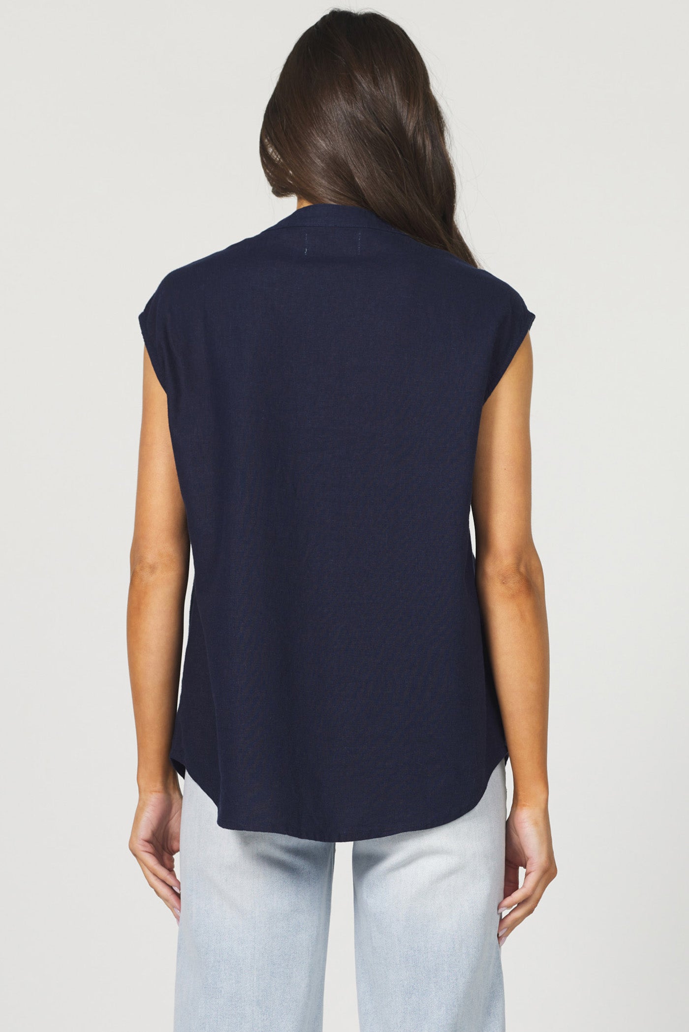 Enhance your wardrobe with the versatile VIDA top in this beautiful shade of navy blue, featuring a stylish V-neck and sleeveless shell that's perfect for crafting comfort.