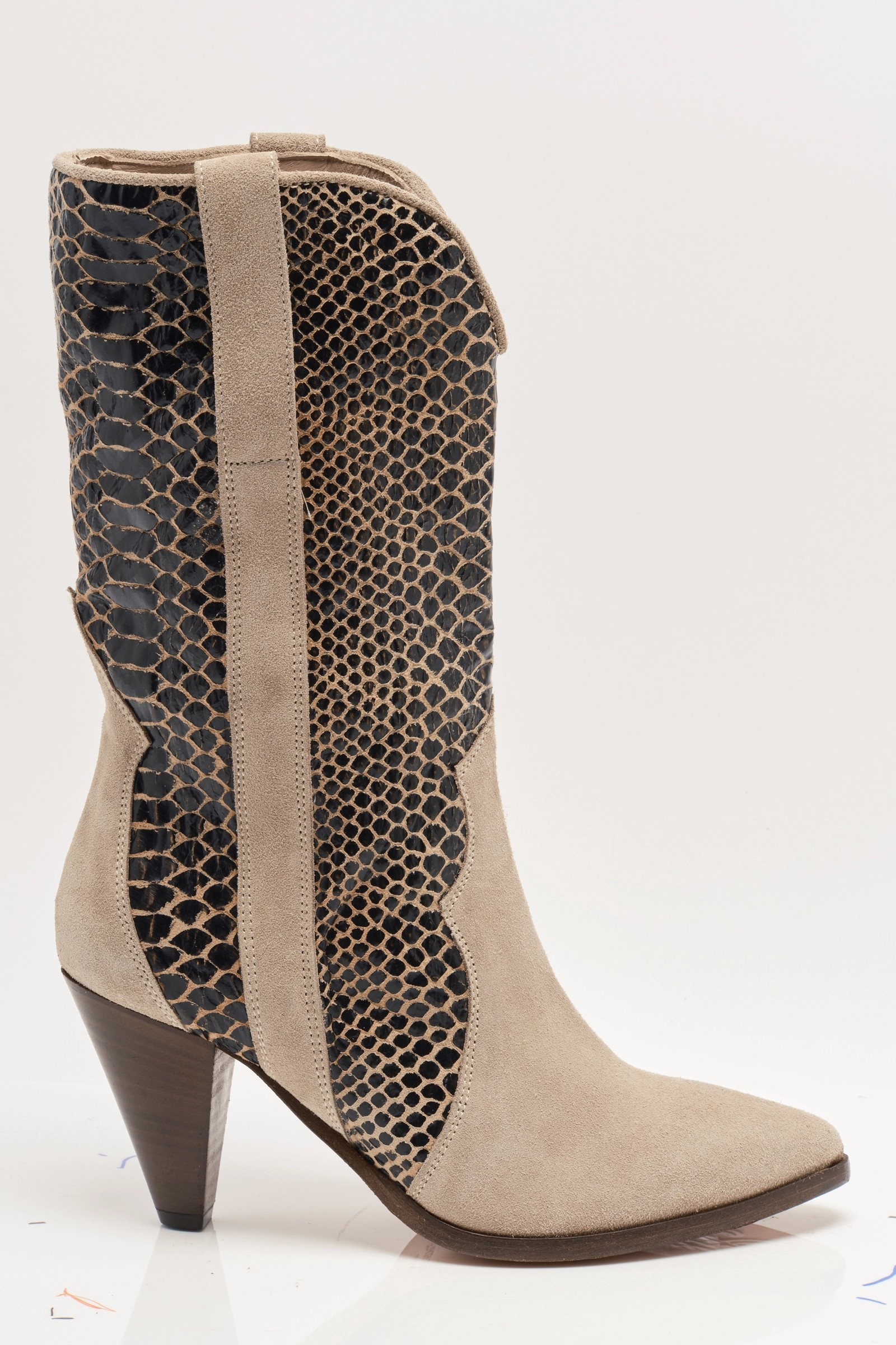 BEIGE SUEDE/SNAKESKIN FEATHER HEEL BOOT