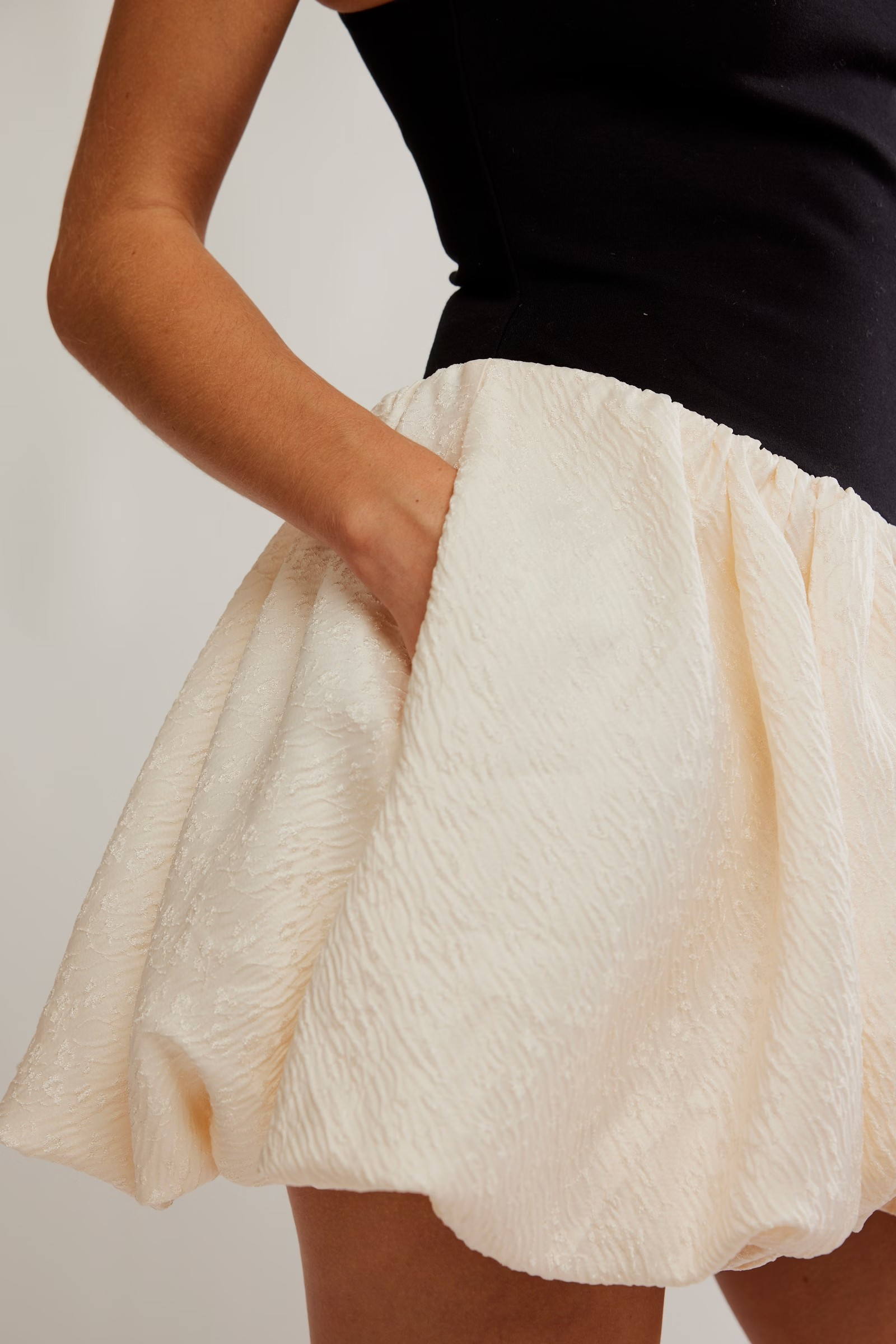 Free People's mini dress is perfect for the holidays, showcasing a sleeveless style with a square neckline for a flattering fit and a delightful bubble skirt that adds a playful touch to the silhouette.