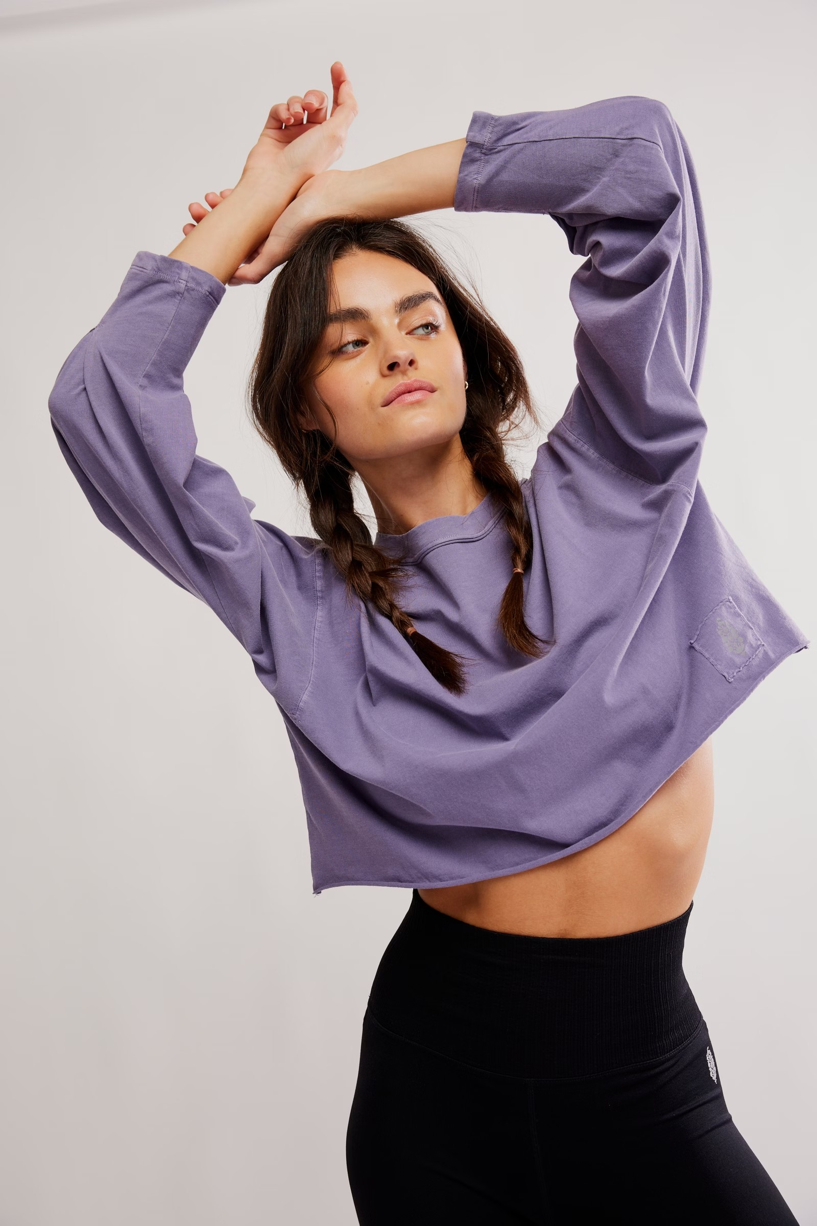 Warm up or cool down in this essential long-sleeve, featured in a boxy silhouette and slightly cropped fit with a classic crew neckline and raw-edge trim.