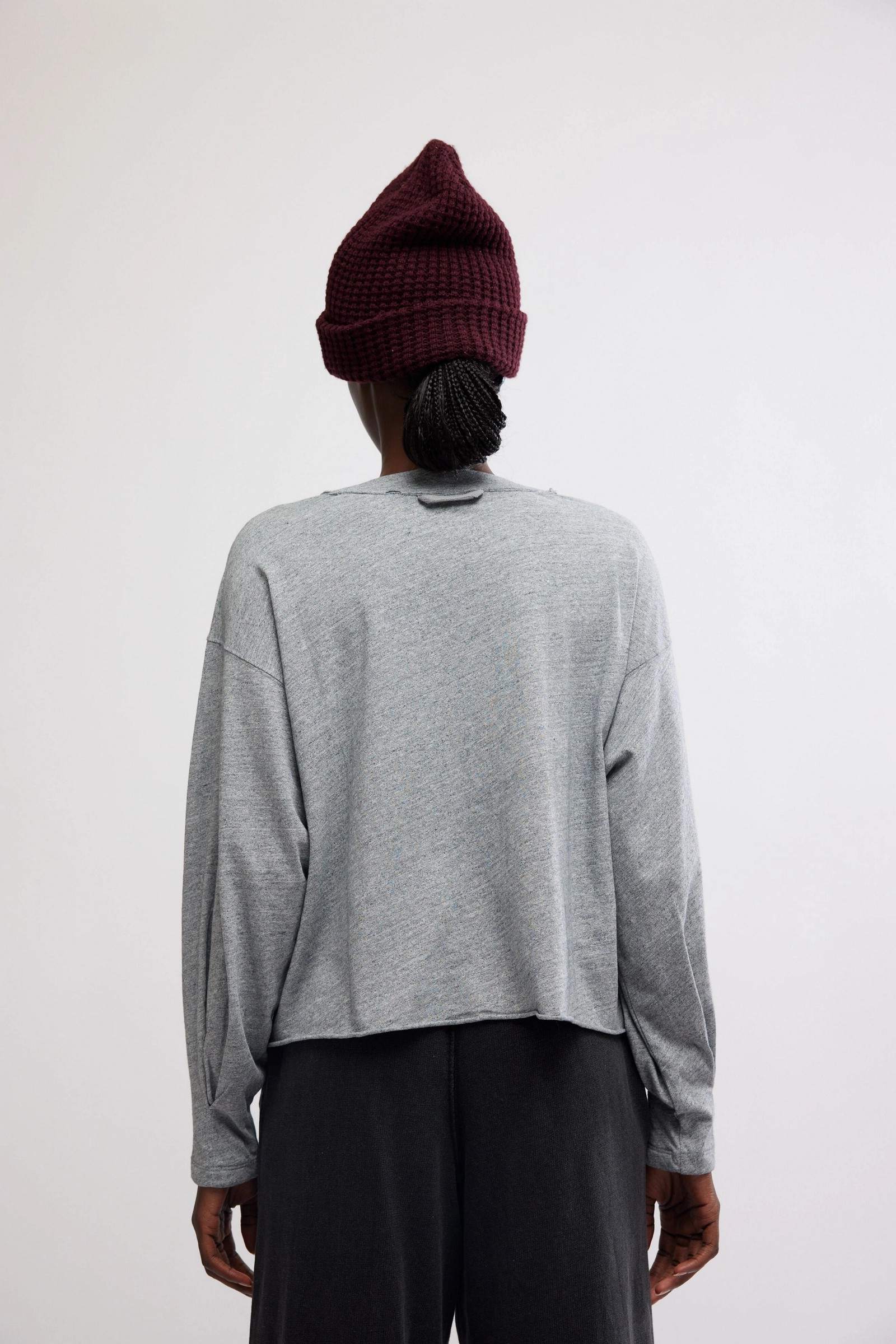 Warm up or cool down in this essential long-sleeve, featured in a boxy silhouette and slightly cropped fit with a classic crew neckline and raw-edge trim.