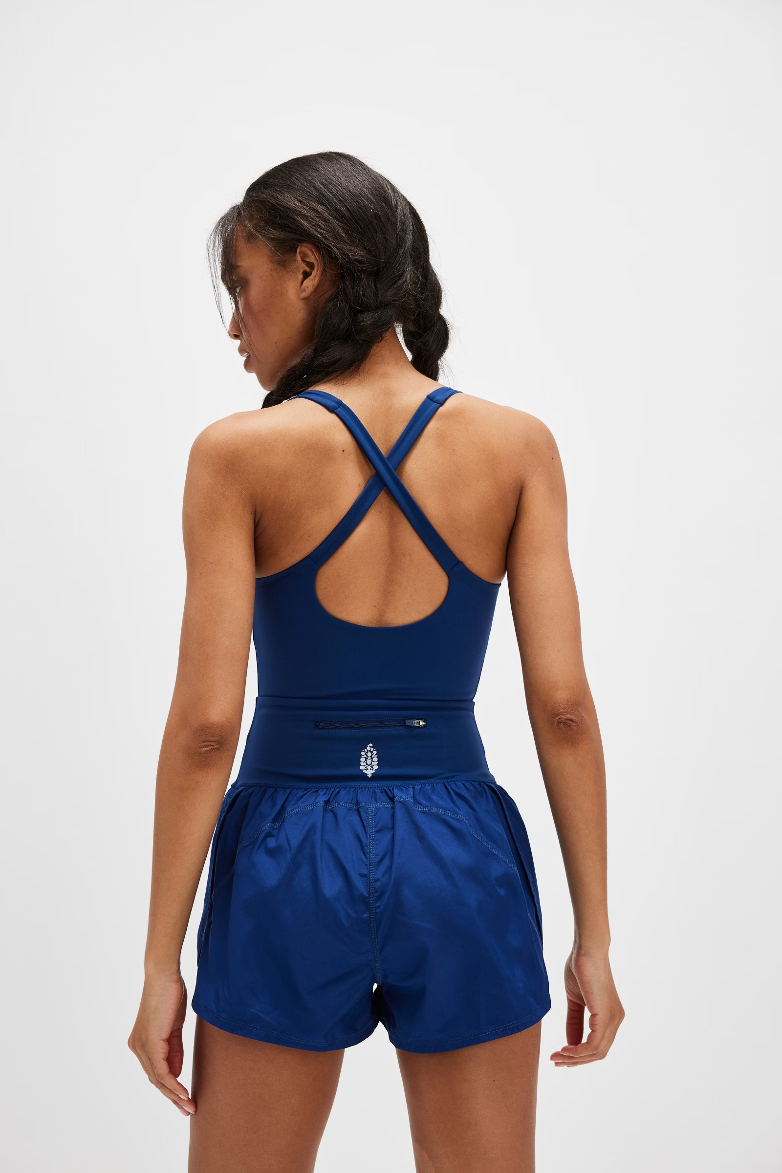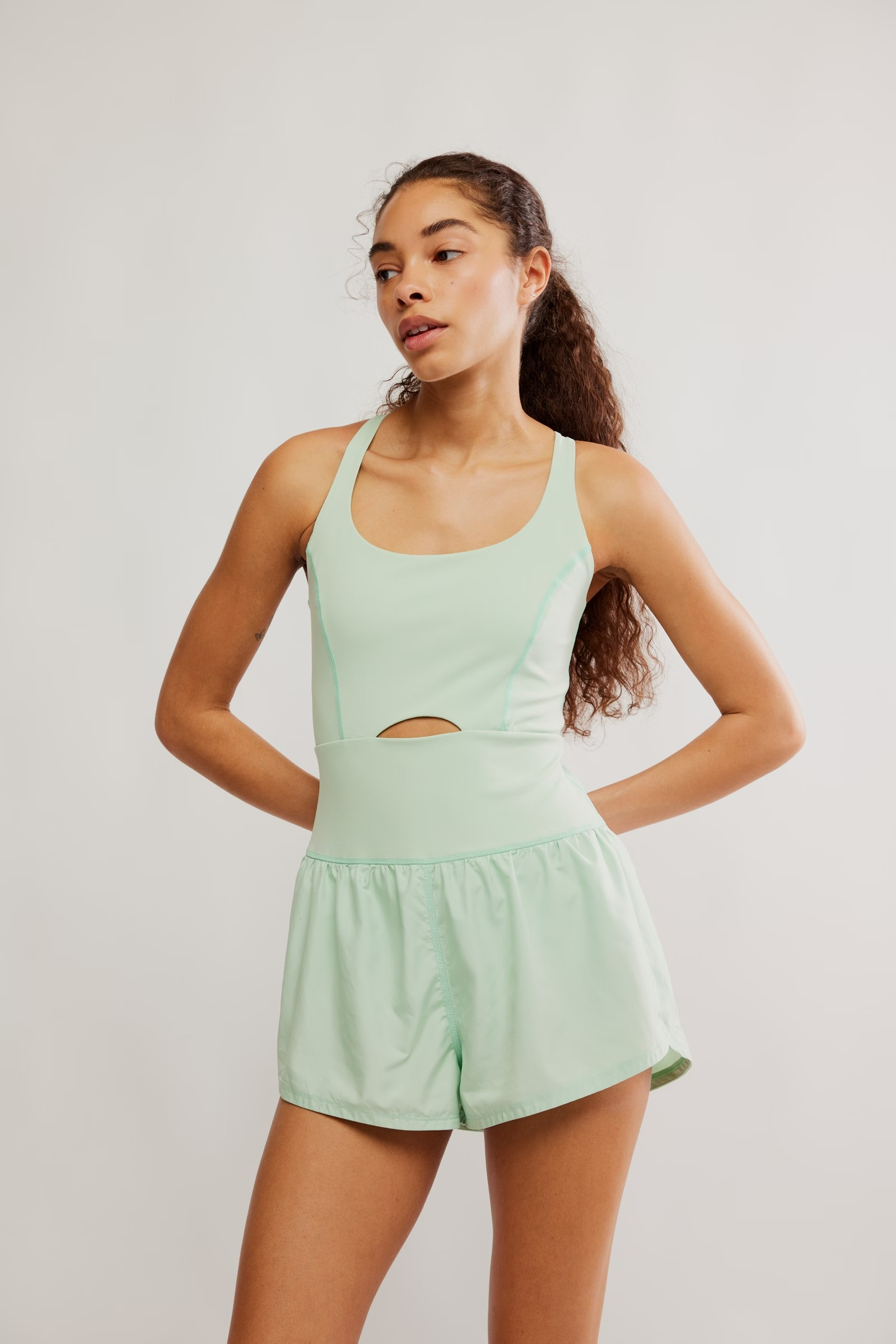 The perfect one-and-done running outfit, this easy romper features a slim-fitting top with a cooling cutout at the center and airy retro-style shorts.