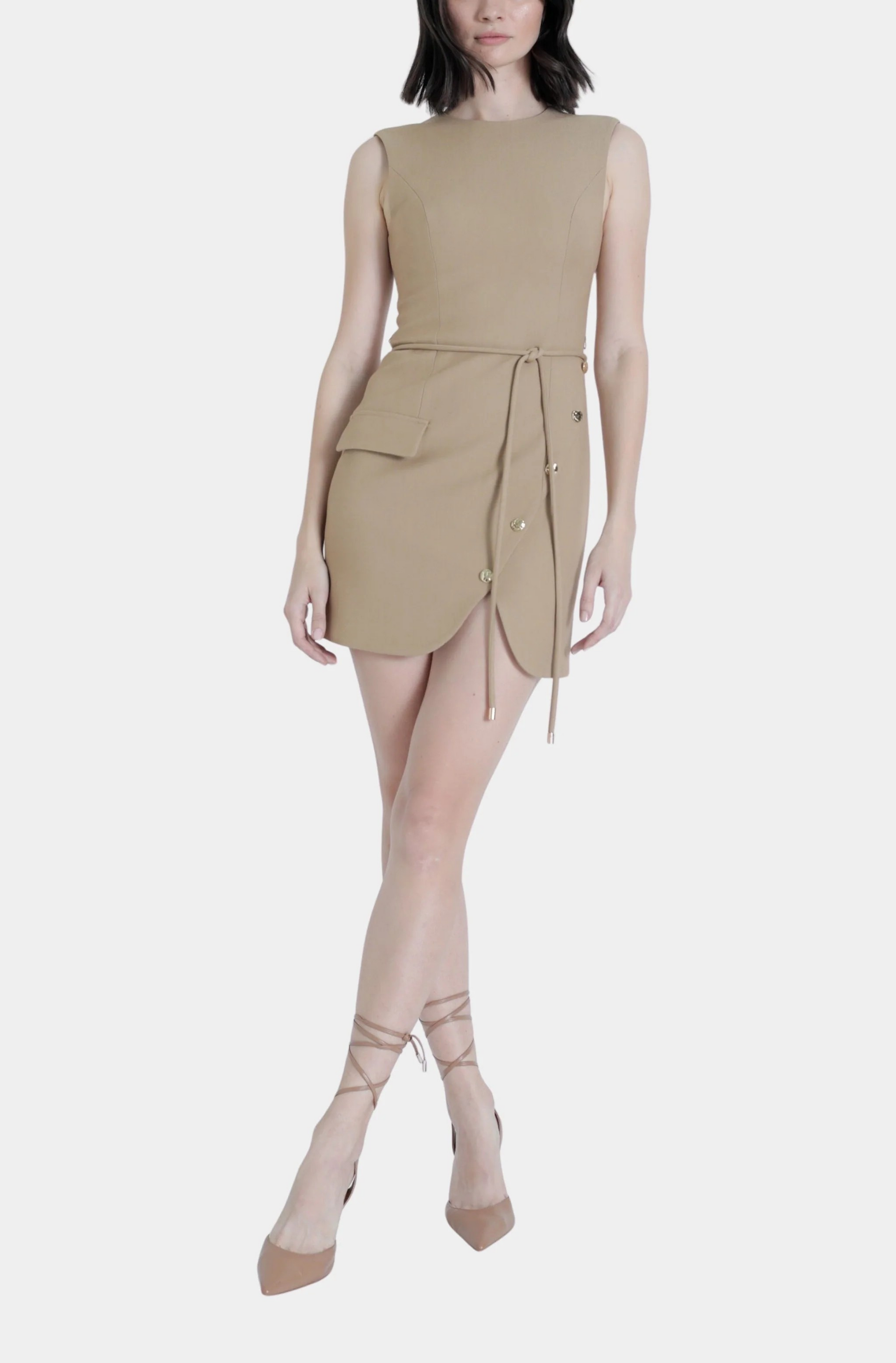Elevate your formal wardrobe with the Zara Mini Dress. This sleeveless mini features a center back invisible zipper for a seamless look, while the button detail on the skirt adds a touch of elegance. Crafted by Karina Grimaldi, this mini dress is perfect for making a stylish statement at any event.