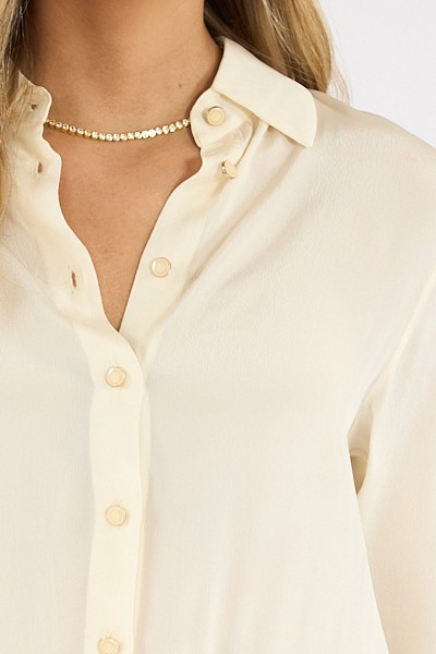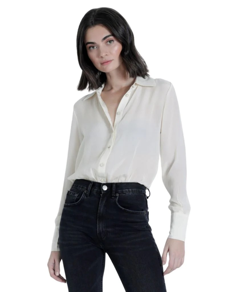 The Alyssa Bodysuit is an easy chiffon top with a button front and cuffs.