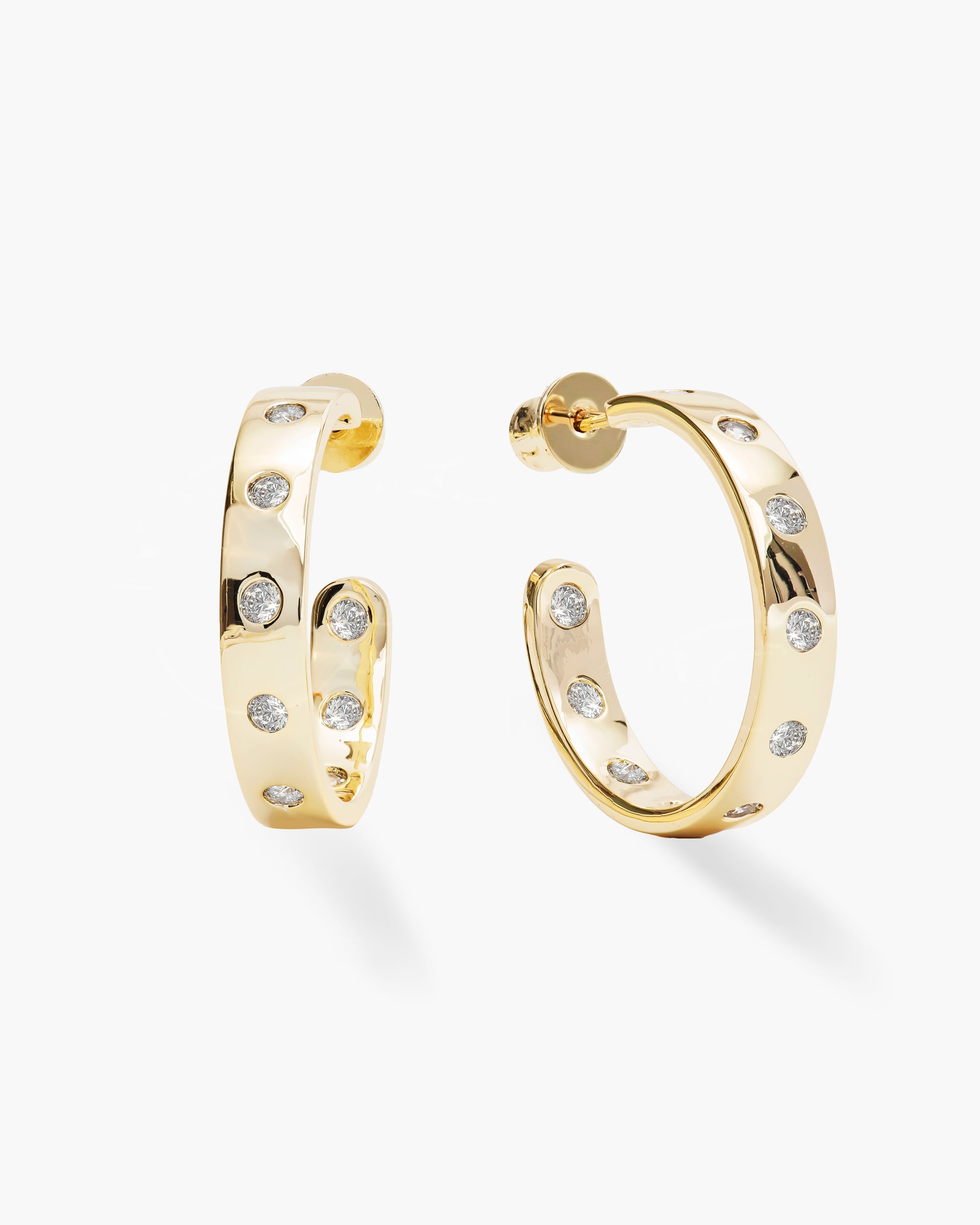 A refined hoop in the perfect everyday size, defined by smooth, polished curves and bezel-set round simulated diamonds that strike the perfect balance of polish and ease.