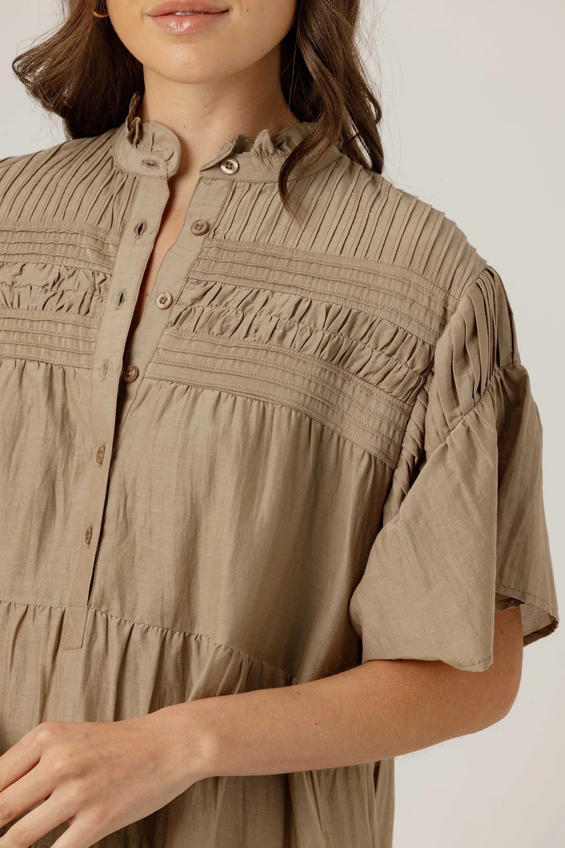 Crafted from our airy cotton-silk blend, the Armadine Dress features delicate pin-tuck detailing, fluttery flounced sleeves, and soft tiers that create an effortlessly billowy silhouette. Lightweight and breathable, it falls to mid-thigh on most wearers and runs slightly oversized—size down for a more slim fit.