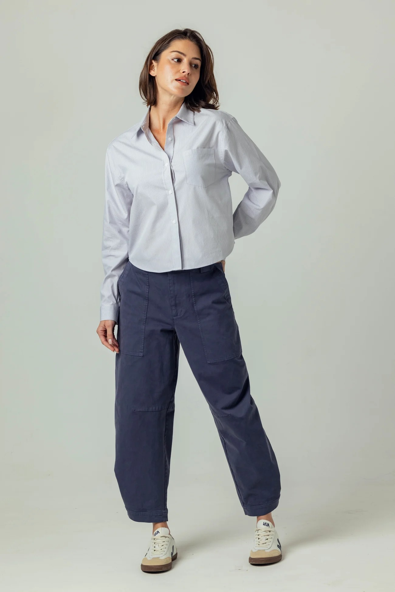A modern take on the classic button-up. Finn is a fitted with a slightly rounded shirt-tail hem shape. This shirt features clean tailoring, featuring a classic button up fit. A classic reimagined. Designed in our timeless cotton yarn-dyed titanium striped poplin, the back yoke feature a unique criss-cross detail—an unexpected twist that sets Finn apart. Finn is slightly cropped and may show some midriff on some.